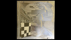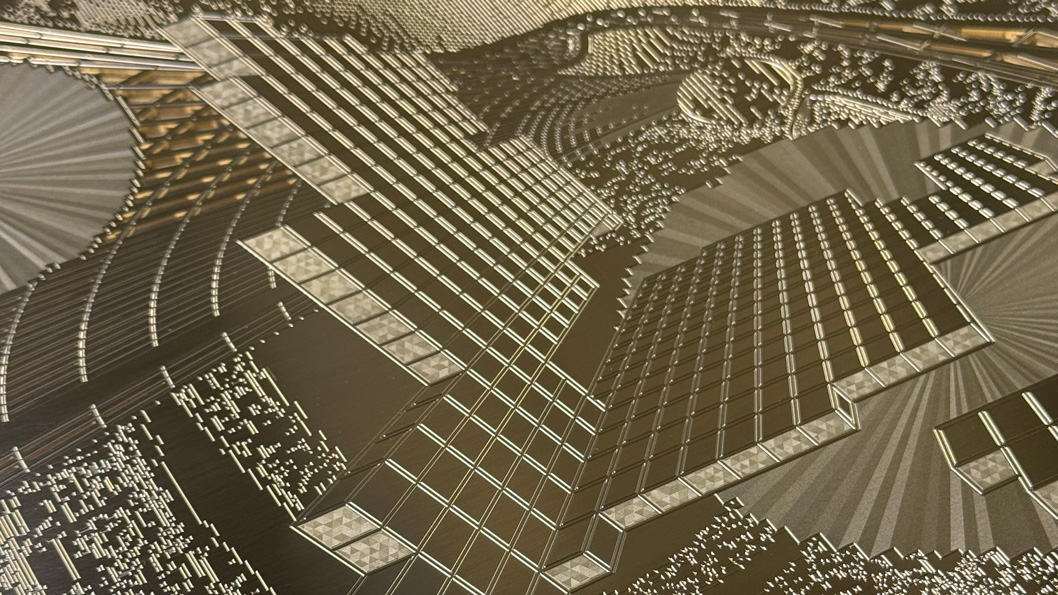 Two embossings were carried out on the 50 x 50 cm artwork using a BOBST hot stamping machine, which was operated by Abellan in Barcelona. In the first step, flat embossing was carried out using the transparent LIGHT LINE® Laser Seamless TS-XL, and in the second step, relief embossing was added using LIGHT LINE® Laser Seamless AL-XL. The embossing tools used for this were supplied by KURZ subsidiary H+M. A total of 500 copies were embossed in a limited edition.